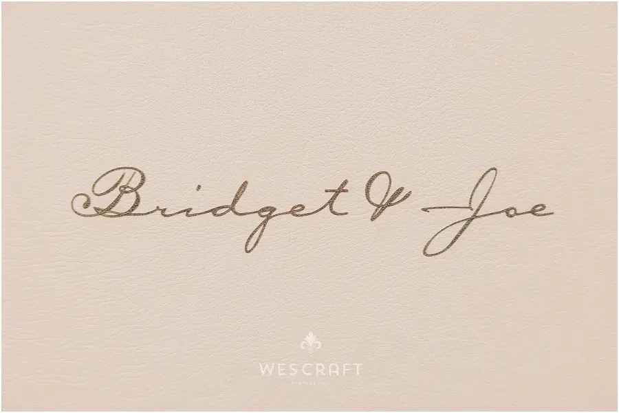 This book starts with a Distressed Leather cover in Cream. We etched their names in Carpenter Script. A custom bronze metallic finished linen was used for the cover’s inner lining as well the storage box. I thought this would really bring out the fall colors in the book! What do you think?