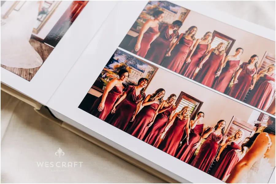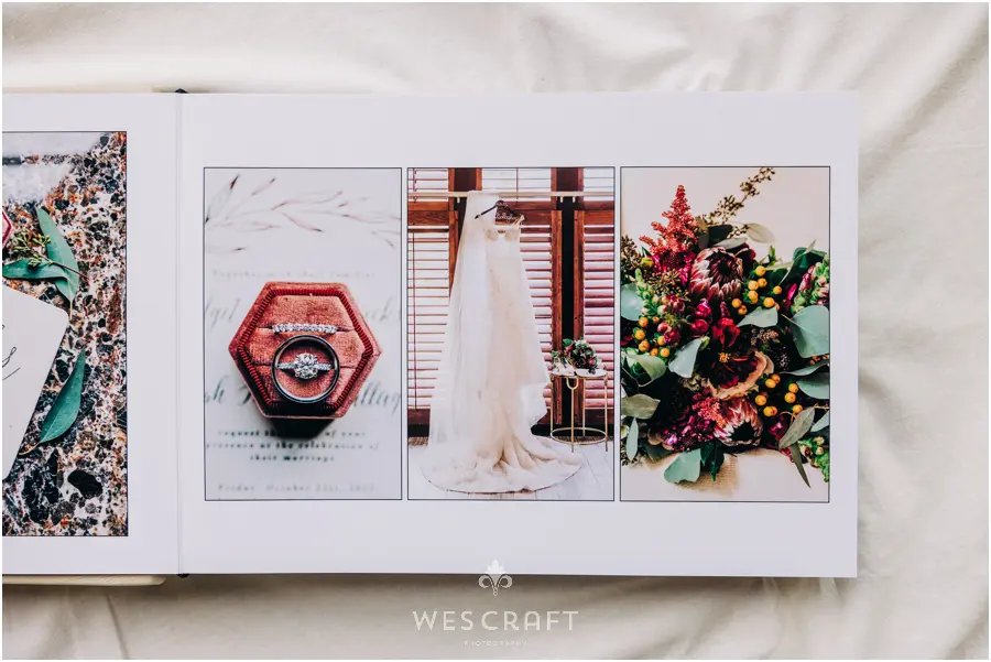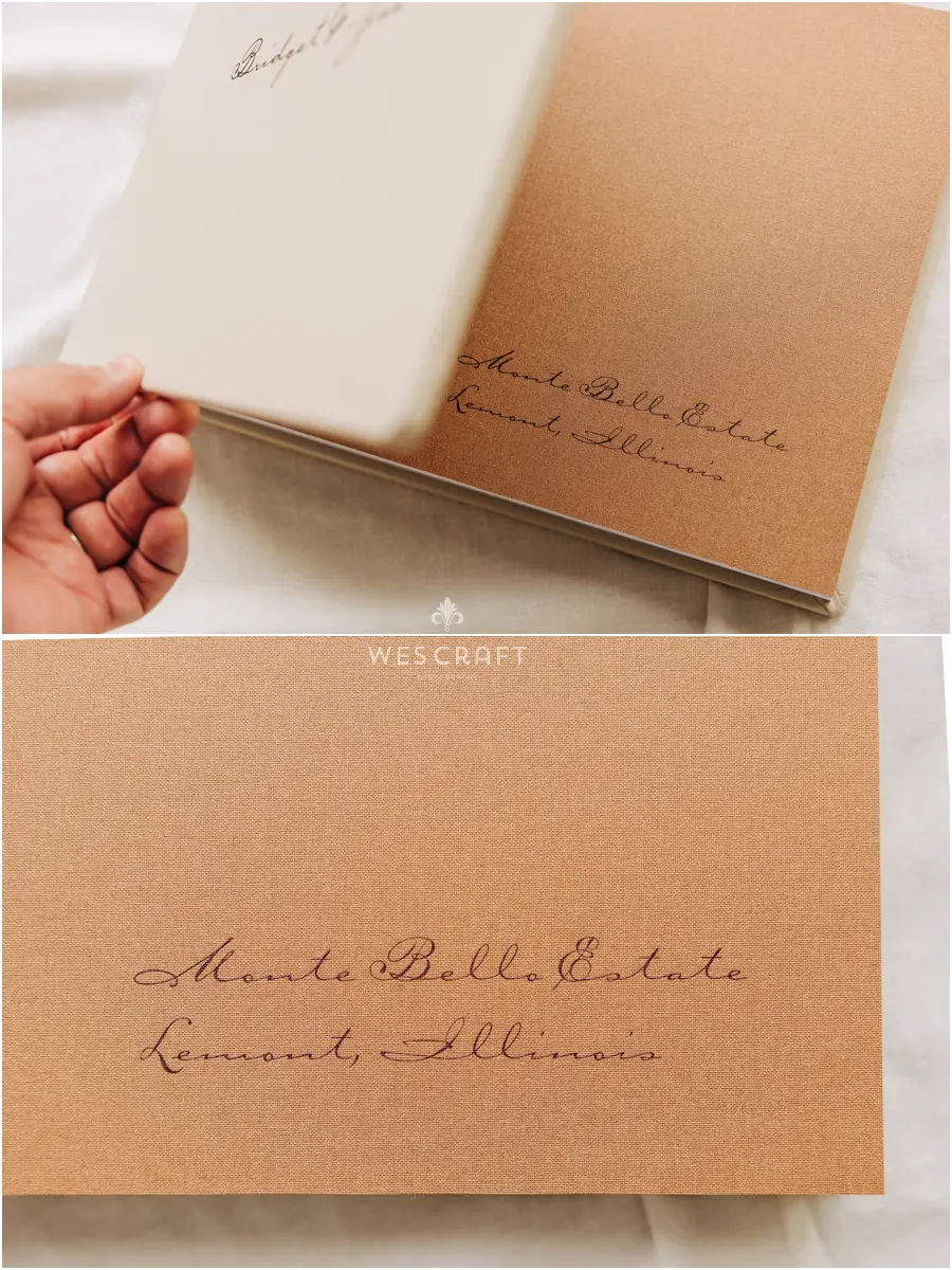 This book starts with a Distressed Leather cover in Cream. We etched their names in Carpenter Script. A custom bronze metallic finished linen was used for the cover’s inner lining as well the storage box. I thought this would really bring out the fall colors in the book! What do you think?
