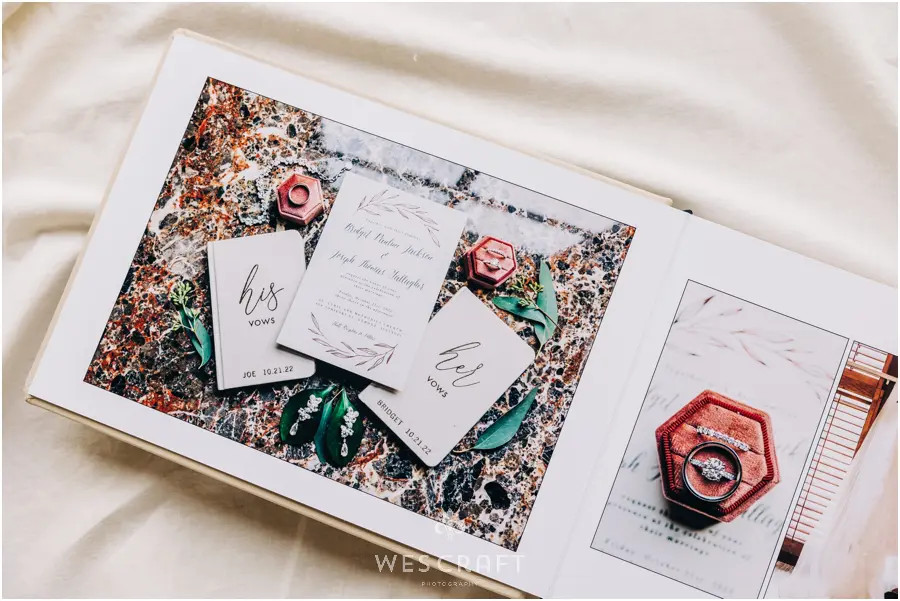 This 10×14 Heirloom Album got a couple optional upgrades including the Distressed Leather material and the custom cover lining with the event location printed.