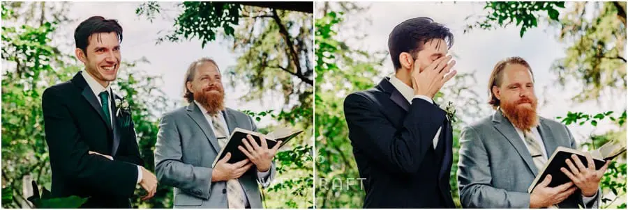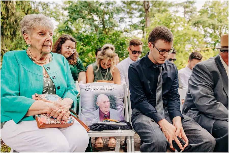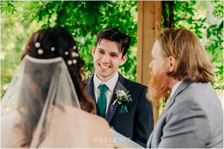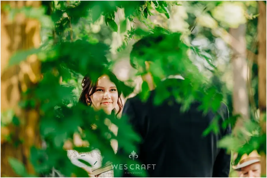 The shade of tall trees and the vine laden trellis kept the couple and their guests somewhat cool.