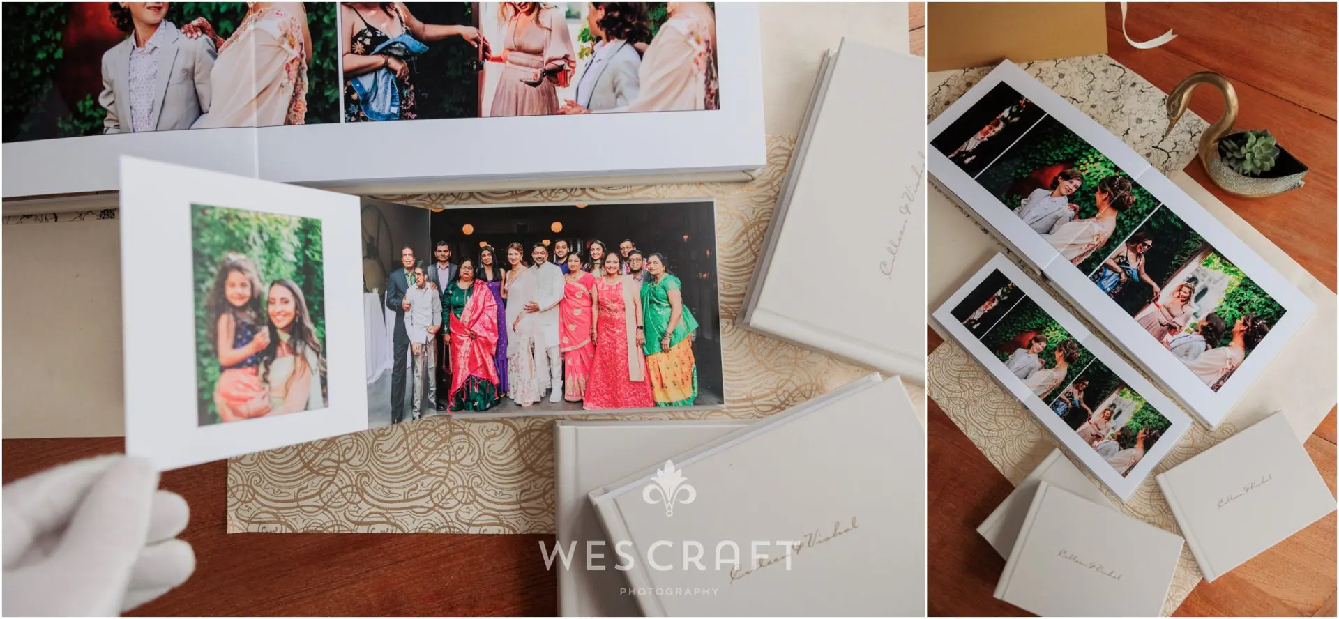 What are we lookin at here? It’s our 10×14 album bound in a cream Distressed Leather cover. We etched the title in our Carpenter Script. V&C added four 6×8″ Purse books for parent and grandparent gifts.