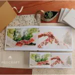 What are we lookin at here? It’s our 10×14 album bound in a cream Distressed Leather cover. We etched the title in our Carpenter Script. V&C added four 6×8″ Purse books for parent and grandparent gifts.