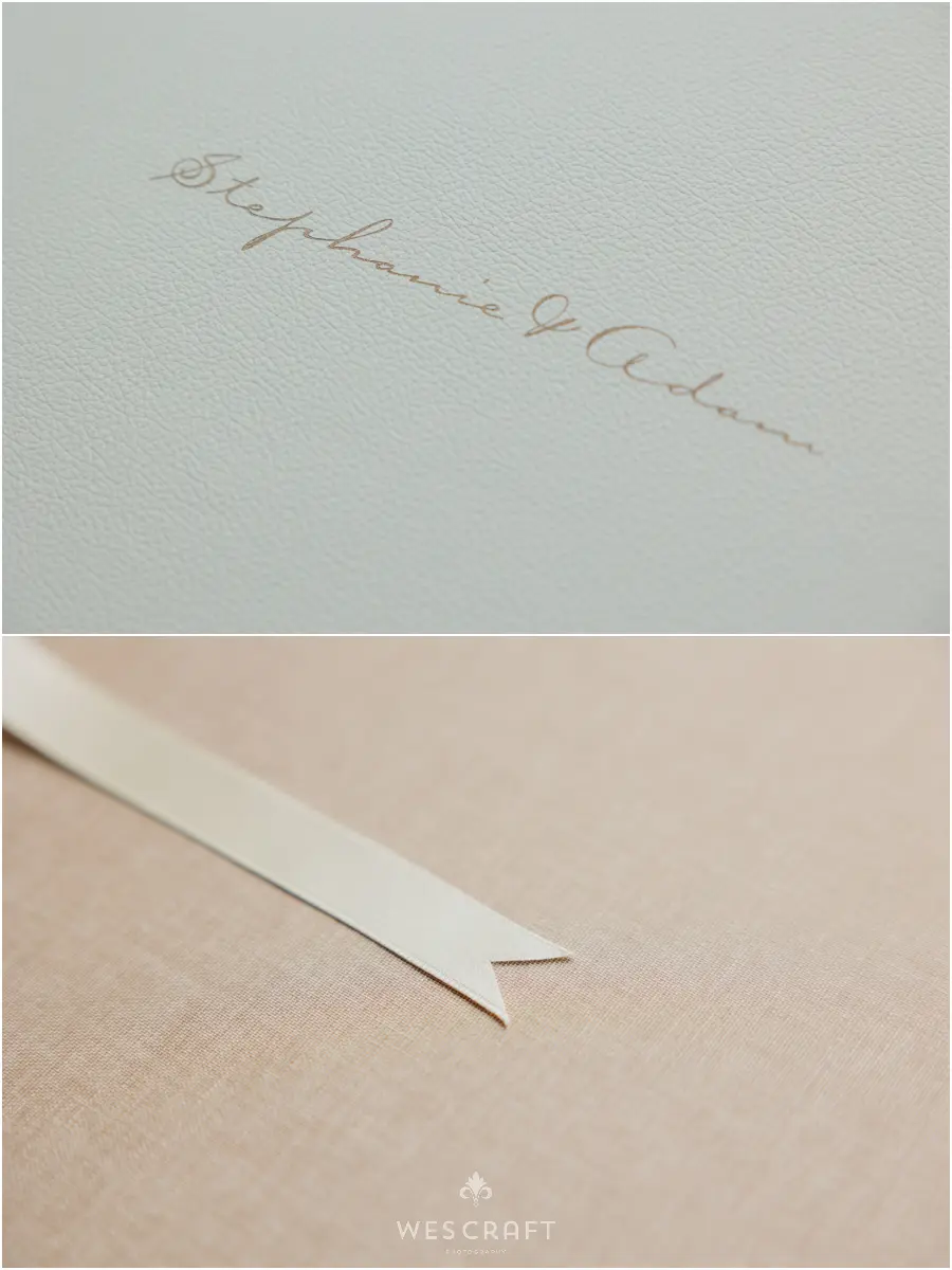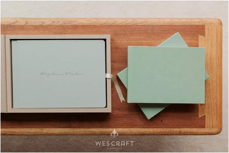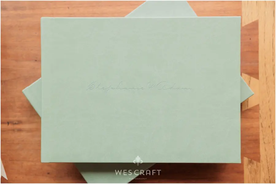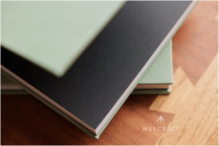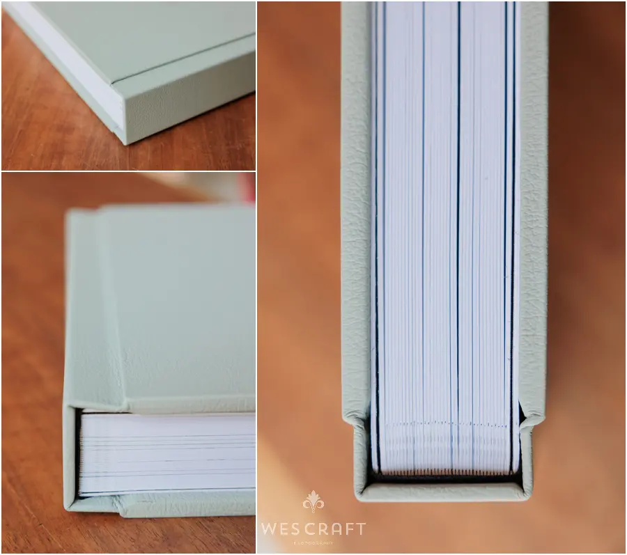 2 parent albums were ordered in 8×12 with upgraded covers. These typically ship with a glossy hardback but S&A had us dress them in an engineered leather. This Sage was the closest we had to the master album’s Sage Grey Signature Leather.